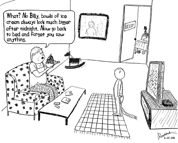 Here’s the first scenario: You rushed your child off to bed and read the shortest story you could find. A quick kiss goodnight, shut the door and head for the kitchen. You plop onto the couch with a huge piece of chocolate cake and dive in. The Rootstock Book of Parenting Laws clearly states that the night you rush your child off to bed so you can dive into the chocolate cake is the night your child can’t sleep and walks in on you, the couch and the cake. Now your child is suddenly too hungry to sleep and is screaming something about things being unfair and he’s running away.