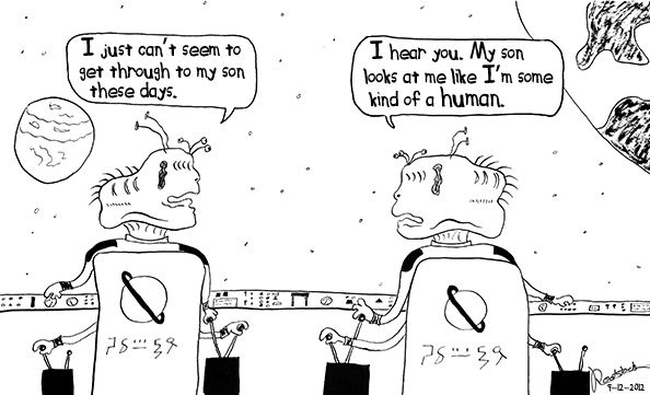 They are the aliens. I speak truth – from around 12 until well into adulthood, they are indeed alien creatures. At times, when you look at them or they speak, you don’t even recognize them. They don’t resemble those cute little well-behaved offspring you used to have. They say it is you who is the alien, but don’t get sucked into the mind games. It is indeed them. Just now beginning to recognize my 27 year old a little bit:-)