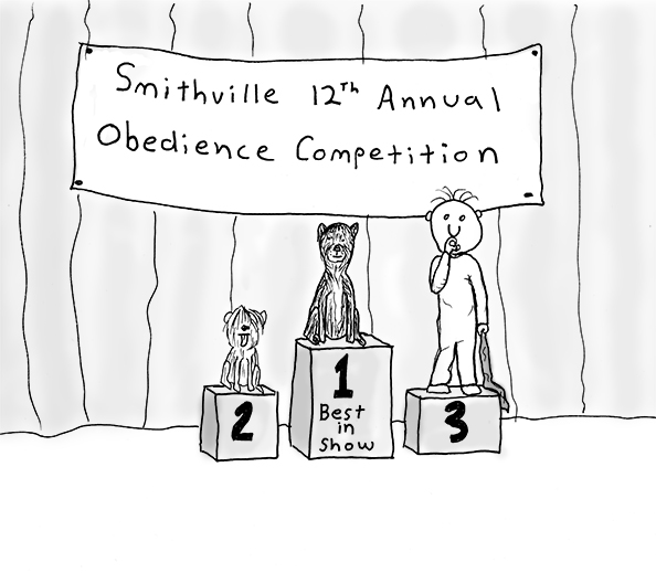 This next cartoon really is just a depiction of what would happen if my son had entered an obedience competition when he was a toddler. At least he made it to the podium…
