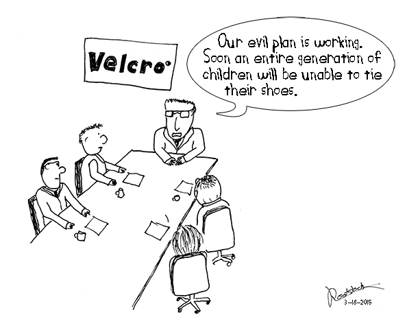 The last cartoon came to me as I watched my son close up his shoes using Velcro and realized that he was nearing 10-years -old and still had no idea how to tie his shoes. Thanks, Velcro.
